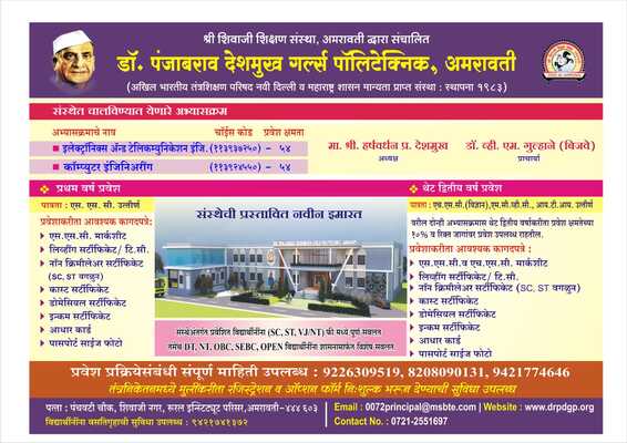 The Dr. Panjabrao Deshmukh Girls' polytechnic, Amravati is one of the promising institutions of Amravati. It has achieved an eminent place in the Amravati region since 1983. It is an offshoot of the prestigious Shree. Shivaji education society. It has highly Qualified and experienced faculty members eager to impart knowledge to students Molding them into better human beings. The College Provides excellent infrastructure catering to the overall Needs of the next generation. It has well-equipped laboratories, instruments.